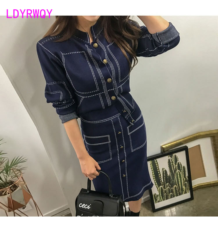 autumn and winter temperament thin color matching knit top + bag hip bottom skirt suit women