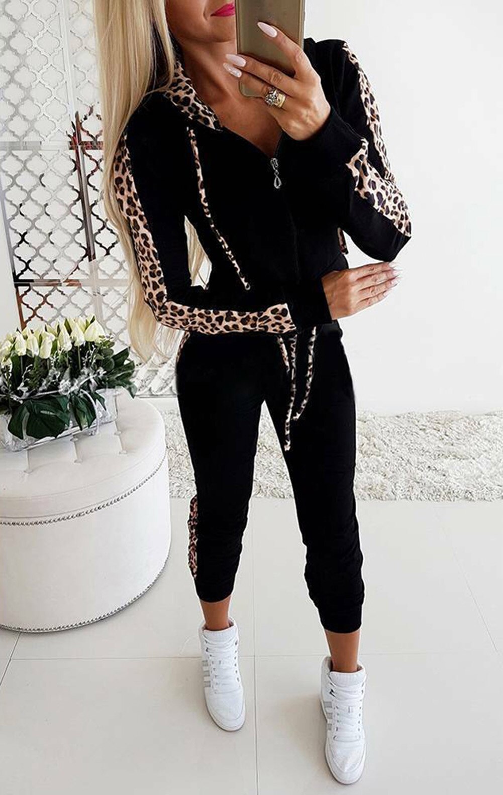 Casual 2Pcs Women Leopard Long Seleeve Hoodies Sports Tops Pants Tracksuit Sweatshirt Sweat Suit Jogging