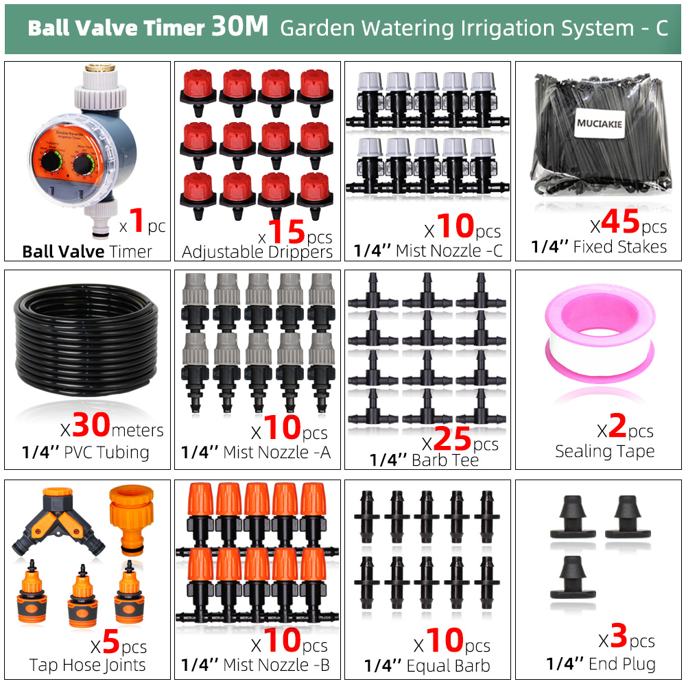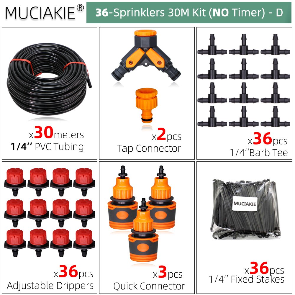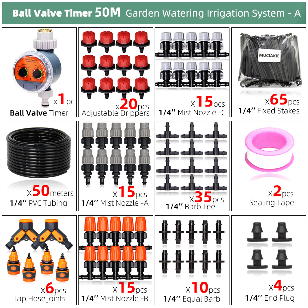 Garden 30-50M Watering Irrigation System Automatic Drip Kit Adjustable Spray Nozzle Dripper Ball Valve Timer 1/4" Hose Sprinkler
